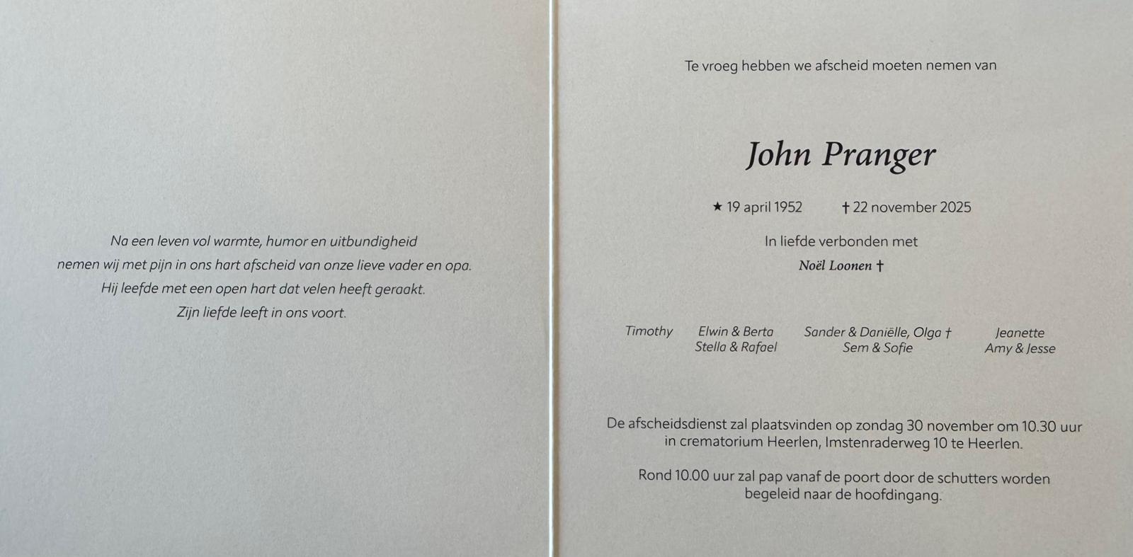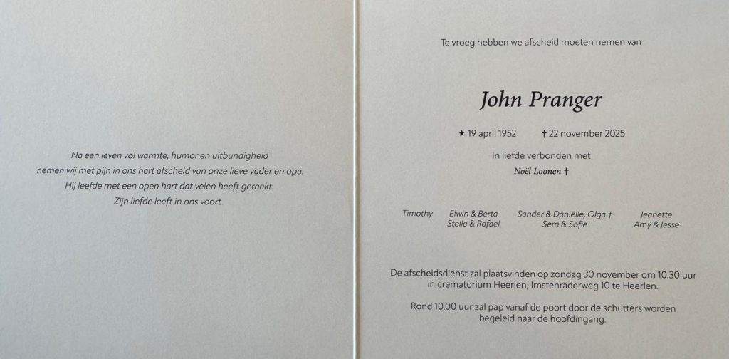 De uitvaartplechtigheid van John Pranger zal met Schutterseer plaatsvinden op zondag 30 november 2025 om 10.30 uur in de aula van Crematorium Imstenrade.